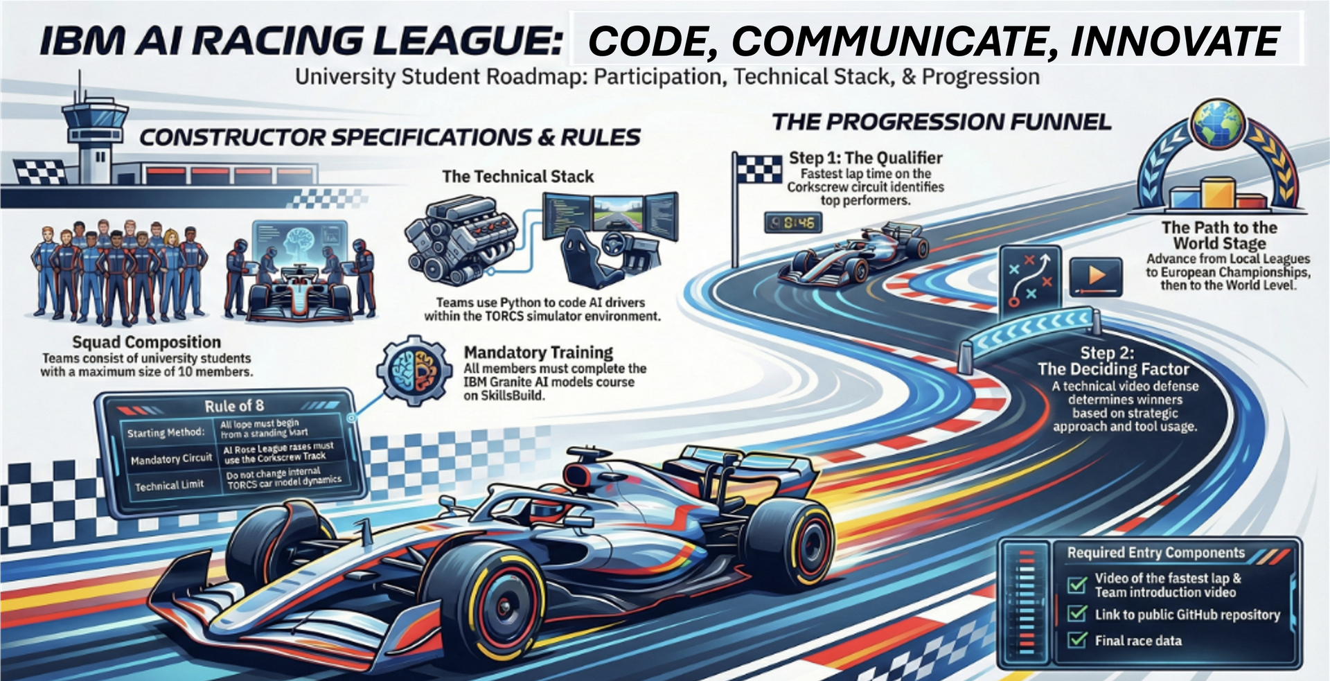 IBM AI Racing League to globalny konkurs IBM, w którym zespoły studenckie budują autonomicznego kierowcę AI. Uczestnicy programują samochód w symulatorze TORCS (The Open Race Car Simulator) w języku Python. Silnikiem AI jest IBM Granite. Natomiast celem kwalifikacji jest uzyskanie jak najlepszego czasu okrążenia na torze Corkscrew.